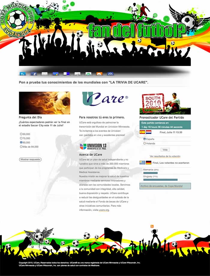 This was a temporary promotional site created for UCare health insurance to run during the 2010 World Cup. It featured a daily quiz question and allowed users to vote on who they thought would win each game.