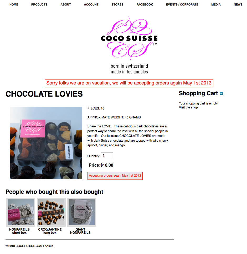 Everyone needs a break and not all of you are giant companies. Some of you are small one or two person operations making gorgeous things with love. I received this question about the online store of one such artisan manufacturer, ‘Coco Suisse” whose chocolates are awesome by the way….